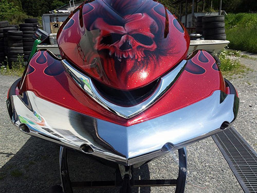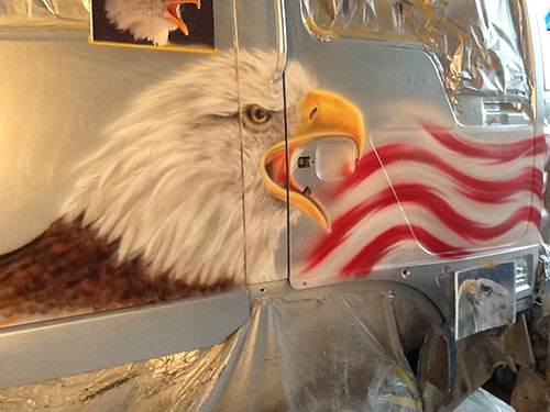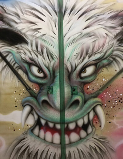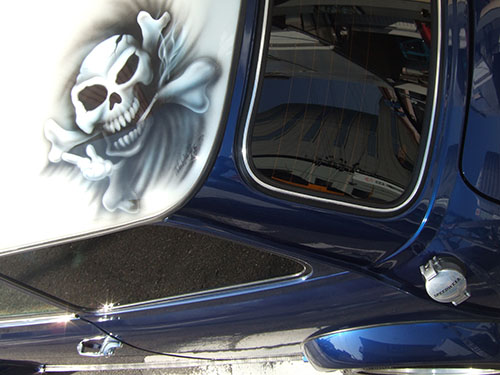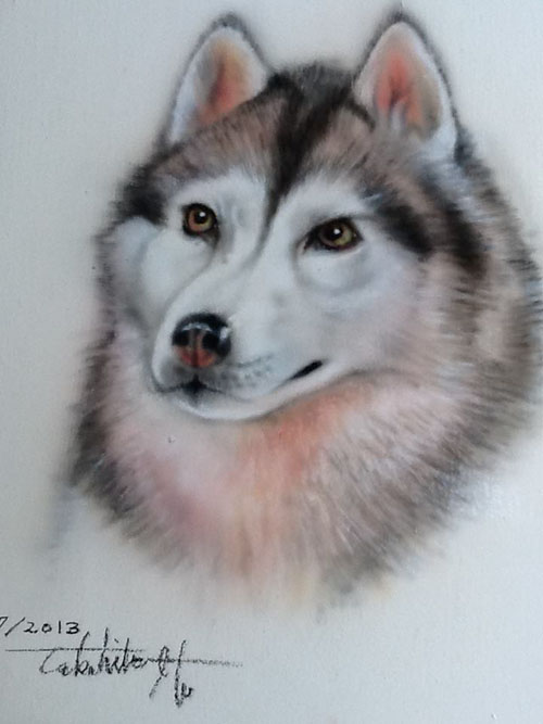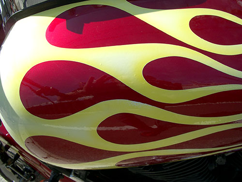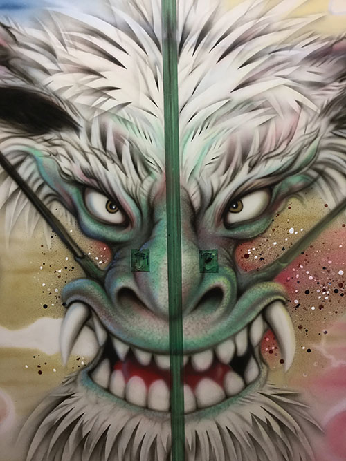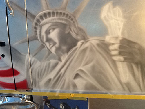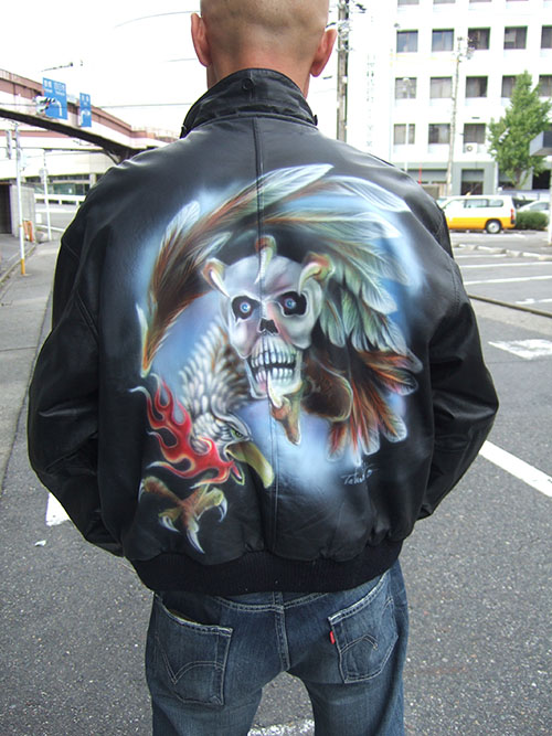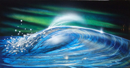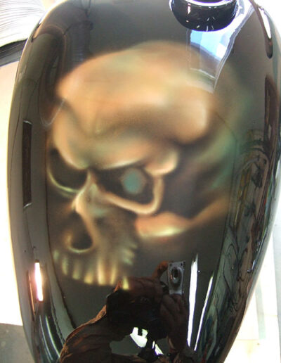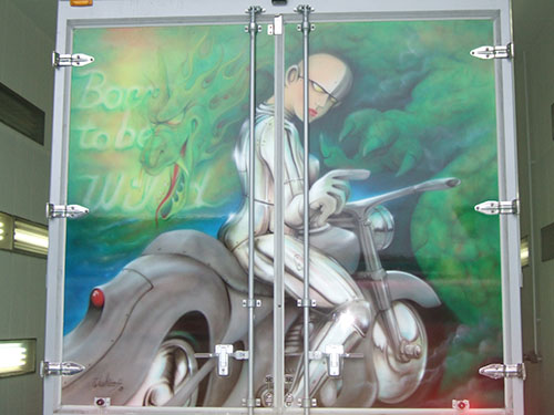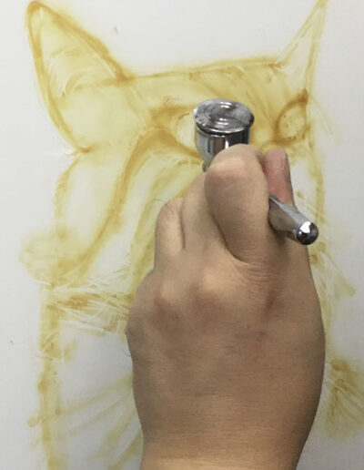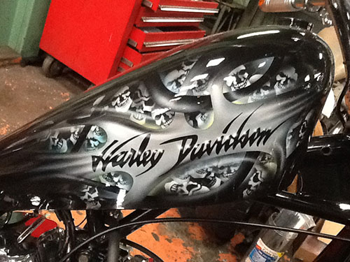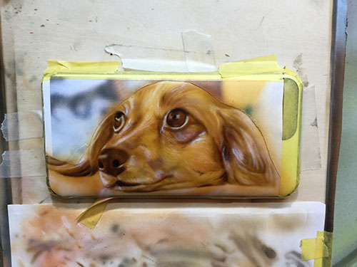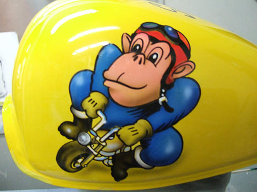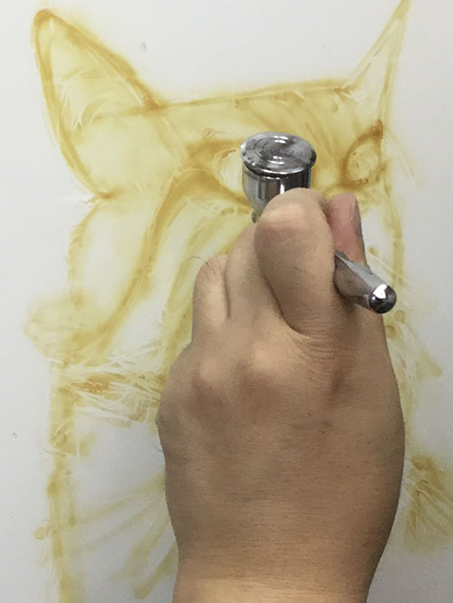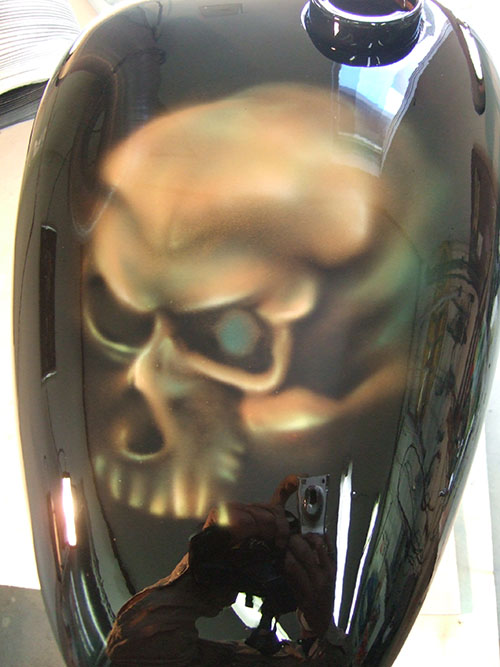 エアーブラシペイントとは、ペンのようなエアーガン<塗装用の吹き付けガンの小型のもの>を使い圧縮した空気と塗料を微妙な配分でガンに吹き付け、ガンの遠近により色の濃淡を造りだして筆で絵を描くのと同じように制作していく技法です。