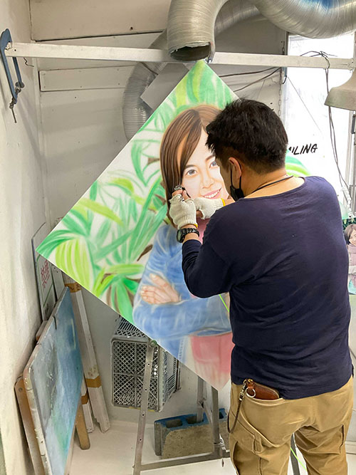 Airbrush painting is a pen-like air gun (a small version of a spray gun for painting) that sprays compressed air and paint in a delicate distribution onto the gun, creating shading of color depending on the distance of the gun. It is a technique that is created in the same way as drawing a picture.